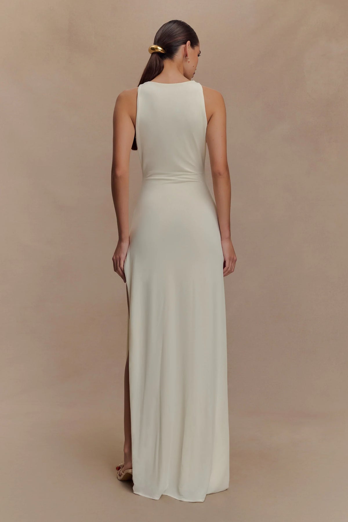 With a daring deep plunge neckline and a perfectly sculpted fit, this maxi was made for moments where you want to own the spotlight. The ruched hip and side cut-out create instant drama, while the shimmering hardware detail takes it up another level. A side leg split adds just the right amount of edge, and the closed back keeps it sleek and sophisticated.
